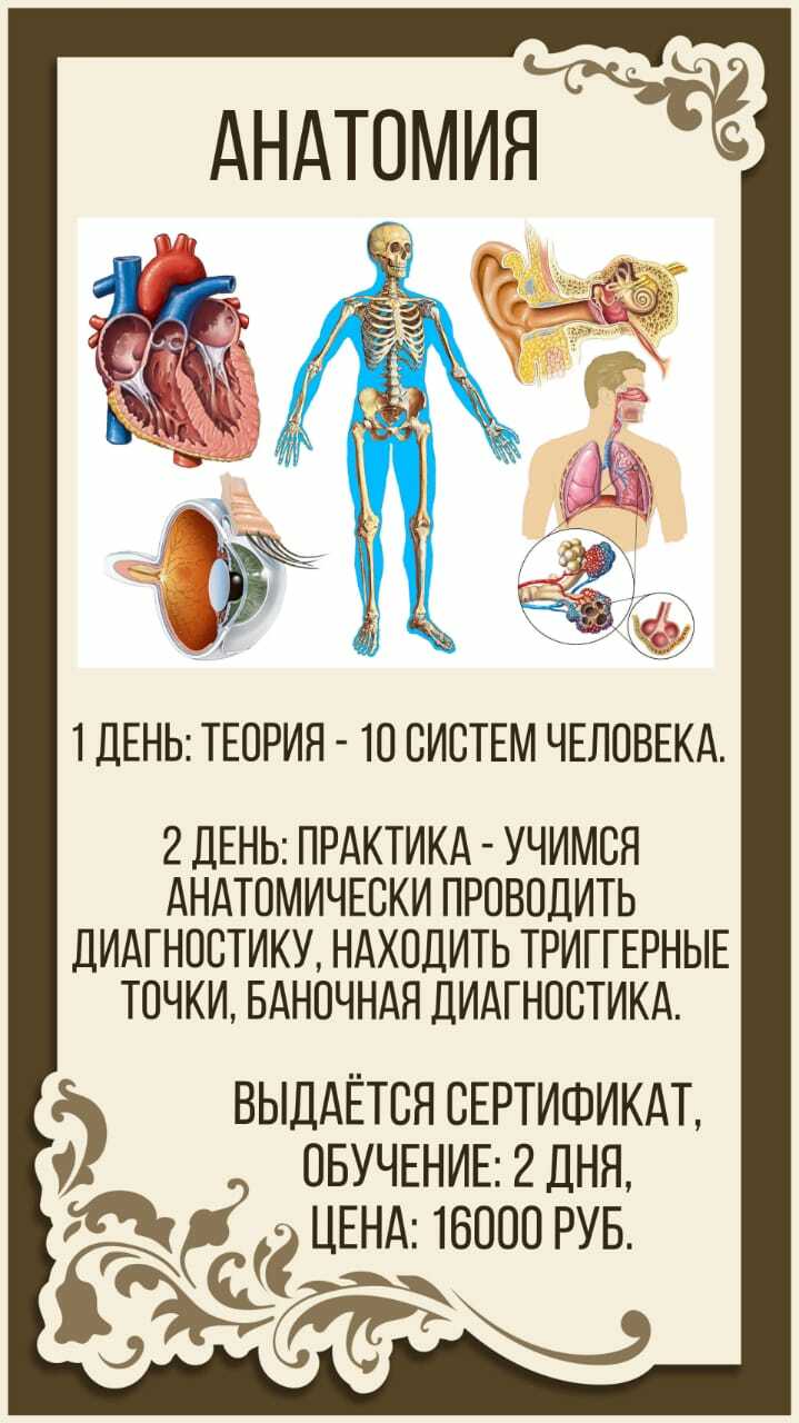Первое занятие пройдет виде лекции и презентации, вы узнаете 10 систем нашего организма. В этой лекции нет много, как говорится воды и лишнего, там только та информация, которую необходимо знать массажисту.