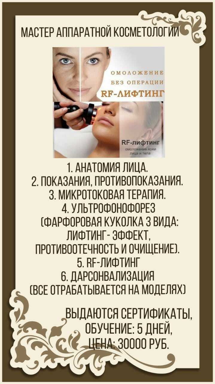 Базовый курс аппаратной косметологии для начинающих и мастеров с опытом. Выдается сертификат международного образца: цена 30000 руб., либо сертификат гособразца г. Москва: цена 35000 руб. Изучите топовые процедуры аппаратной косметологии.