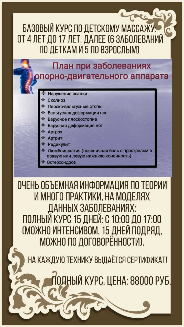 Данный курс поможет вам научиться добиваться потрясающих результатов по детским заболеваниям и помогать облегчить боль взрослым. Вы научитесь действительно помогать людям, ровнять им спинки, ножки, устранять плоскостопие, находить и устранять триггерные точки и т.д.