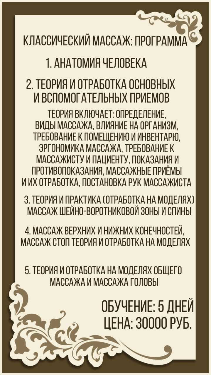 Авторский курс поможет вам освоить азбуку массажа тела, понять чувствительность и изучить способы и приёмы работы с каждой частью тела (от головы до кончиков пальцев).