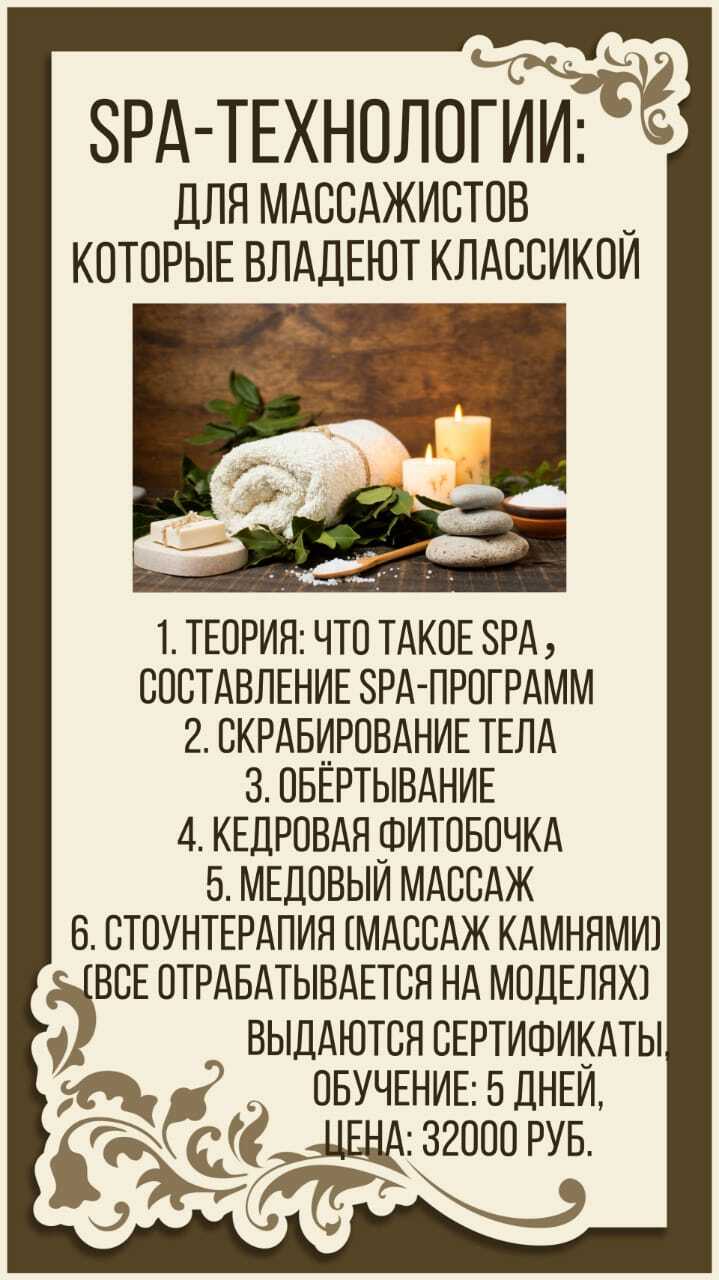 На курсе вы узнаете: подготовку к SPA процедурам, как составить комплексную индивидуальную программу для клиента (в зависимости от проблемы, которую хотите решить), какие бывают SPA процедуры, виды обертываний и их отработка, познаете такой аппарат, как прессотерапия, узнаете все про кедровую фитобочку, как делать скрабирование и медовый массаж, но и в завершении курса изучите потрясающий дорогостоящий Стоунмассаж (массаж холодными и горячими камнями), от которого ваши клиенты будут восторге, если вы им проведете эту процедуру, то они захотят ее повторить снова или приобрести в подарок своим родным и близким.